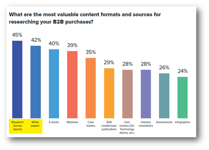 According to a recent report by DemandGen, research/survey reports and white papers were the top two content categories when surveyed B2B Buyers were asked, "What are the most valuable content formats and sources for researching your B2B purchases?"